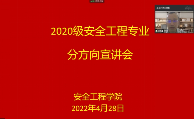 为深化教学改革,调动学生学习的自觉性,培养学生的个性发展,提高学生就业竞争力,从2018级开始,MILE米乐集团对安全工程专业学生实施分方向培养。2022年4月28日晚18:30,MILE米乐集团教学副院长徐锋、安全工程系主任沈斌及各专业方向负责人通过腾讯会议,针对2020级本科生举行了“安全工程专业分方向宣讲会”。
