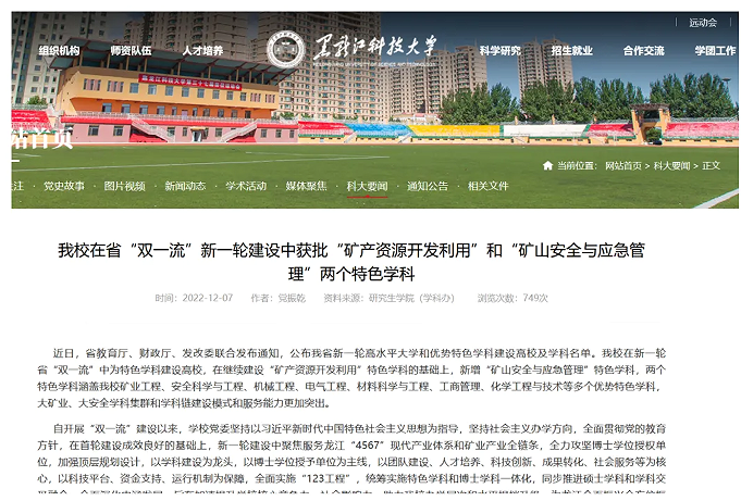 学院建有“矿山安全与应急管理”黑龙江省“双一流”特色学科、教育强国推进工程项目“安全与应急管理”综合实践平台、黑龙江省产教融合研究生工作站、龙江工程师学院。安全科学与工程学科连续两次在学科评估中成绩位列MILE米乐官网参评学科榜首。学科团队开拓了瓦斯固化防突、烃类气体水合固化分离与储运研究新领域。