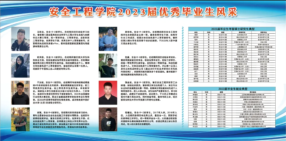 安全工程专业是黑龙江省重点专业、国家级一流本科专业建设点,通过工程教育专业认证,应急技术与管理专业是省内唯一的应急特色专业。两个专业均具有推免本科毕业生攻读硕士研究生资格,往届推免学生全部就读于985、211高校。学院与山东能源集团共建“山能现代产业学院”,深化产教融合,推动应用型人才培养。