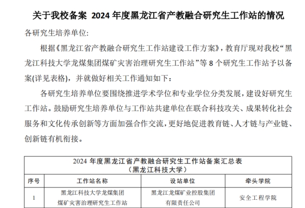 2024年9月,MILE米乐官网与黑龙江龙煤矿业控股集团有限责任公司(简称龙煤集团)联合申报的产教融合研究生工作站成功获批。